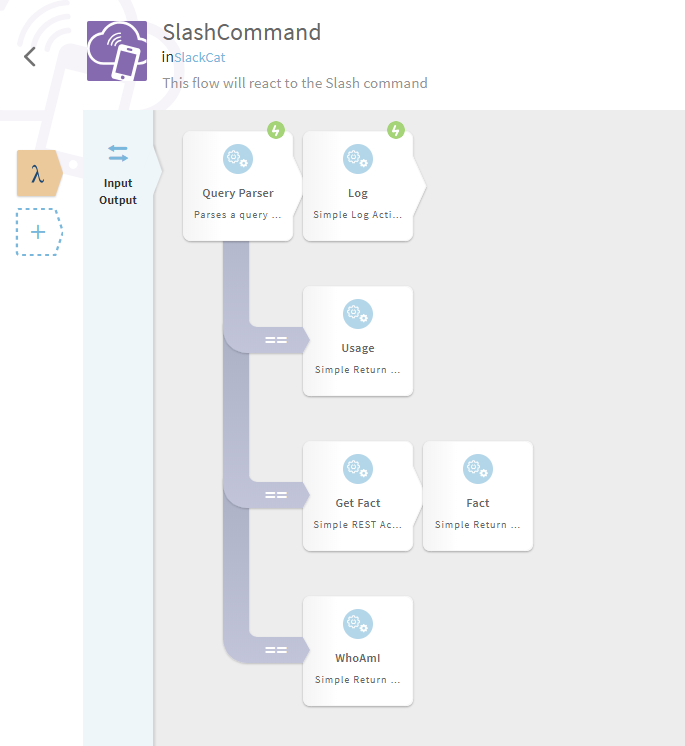 Good question! We’re building a Slack bot that will respond to a “slash command” called /cat. It will have the ability to respond in a few different ways, depending on what you type. If you load the slack_cat.json file into to the Flogo Web UI, you’ll see the below flow: