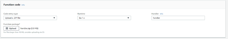 From the Lambda console, click “Create function” (the big orange button). You can choose your own name and IAM role, though the runtime must be set go Go 1.x. If you’ve used Lambda before and want to stick with the default options: