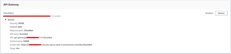 Click “Add” and “Save” to add the API Gateway configuration and deploy your gateway as well. The same section of the page will now show your API Gateway with a dark triangle in front of it. Click that to see the details of your Gateway, and pay attention to the “Invoke URL”