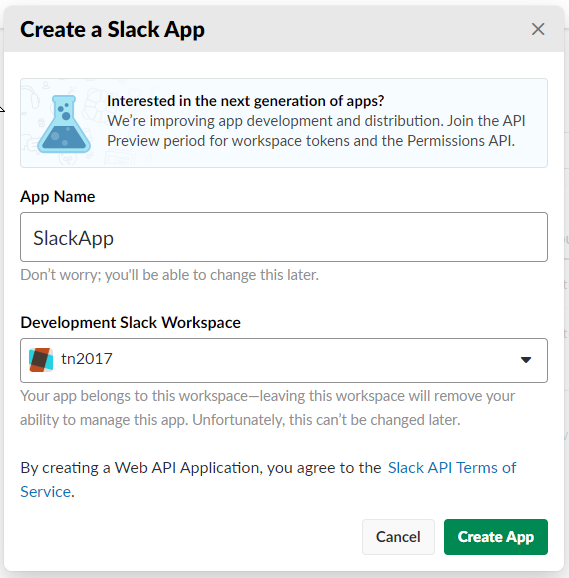Click that and give your app a name and select a workspace to test it in and click “Create App”