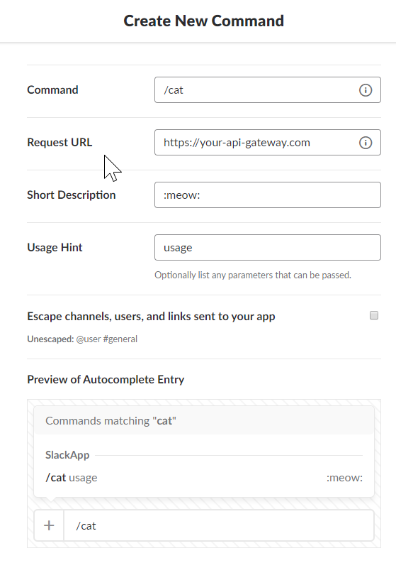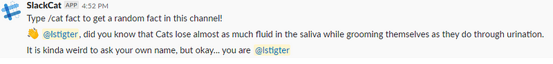 So you’re ready to go and test! Within your Slack workspace you can now type /cat with any of the commands above and see the result. The result will look like